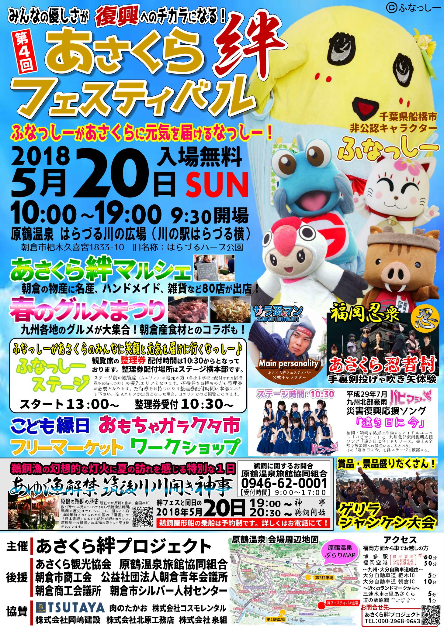 2018年5月20日 10時~19時まで 「第四回 あさくら絆フェスティバル」が開催されます 今年はなんとふなっしーがあさくらに元気を届けてくれます。 場所:はらづる川の公園(川の駅はらづる横) あさくら絆マルシェに春のグルメまつりなど盛りだくさん!! 13:00~ふなっしーステージ 同日「あゆ漁解禁 筑後川川開き神事」も19:00~開催されます