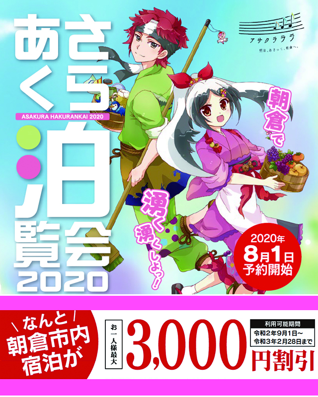 【9月1日~2月28日】 朝倉市内の宿泊がお1人様最大3000円割引!! 8月1日~ご予約開始! 「とくとく朝倉振興券」との併用もできます♪♪ <朝倉市宿泊助成事業2020> あさくら泊覧会公式サイトはこちら https://fukuoka-asakura.com/